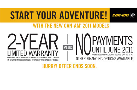 FINANCING OPTIONS: ‡No payments until June 2011: Offer valid at participating dealers on purchases of new and unused 2008-2011 Can-Am ATVs. On a purchase made November 1, 2010, your down payment is $0; no interest charge until May 1, 2011 and no payments until June 1, 2011. Thereafter, 60 consecutive monthly payments. Annual percentage rate is 13.95%. [Annual percentage rate subject to increase after promotional period.] The above financing program is offered by Sheffield Financial, a Division of BB&T Financial, FSB. Minimum Amount Financed $1,500; Maximum Amount Financed $40,000. Subject to credit approval. Approval, and any rates and terms provided, are based on credit worthiness. Other financing offers available. Financing promotions void where prohibited. BRP is not responsible for any errors, changes or actions related to financing provided by Sheffield Financial. BRP reserves the right, at any time, to discontinue or change specifications, prices, designs, features, models or equipment without incurring obligation. Some models depicted may include optional equipment. BRP highly recommends that all ATV drivers take a training course. For safety and training information, see your dealer or call the ATV Safety Institute at 1-800-887-2887.